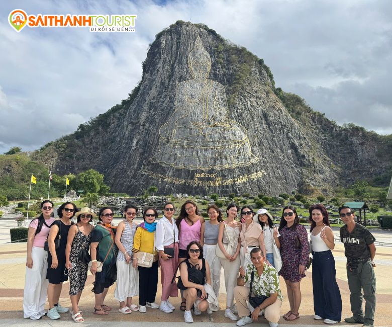 - Tiếp tục tham quan “Trân Bảo Phật Sơn” hay còn gọi là Khao Chee Chan, nơi được tạo nên kỷ niệm 50 năm đăng cơ của nhà vua Thái Lan. Là một ngọn núi đẹp nổi tiếng nằm ở tỉnh Chon Buri, cách Pattaya – thiên đường biển đảo Thái Lan chỉ khoảng 15 km, Nổi bật giữa thiên nhiên hùng vĩ và vẻ đẹp hoang sơ của thiên nhiên là bức tượng nổi Thích Ca Mâu Ni Phật đang ngồi tọa thiền được tạc trên vách núi cao, Bức tượng cao đến hơn 100 mét, rộng khoảng 70 mét, được đúc nổi hoàn toàn bằng vàng ròng 24 cara, được tiến hành xây dựng vào năm 1996 nhân dịp Quốc vương Rama IX trị vì vương quốc Thái Lan được 50 năm.