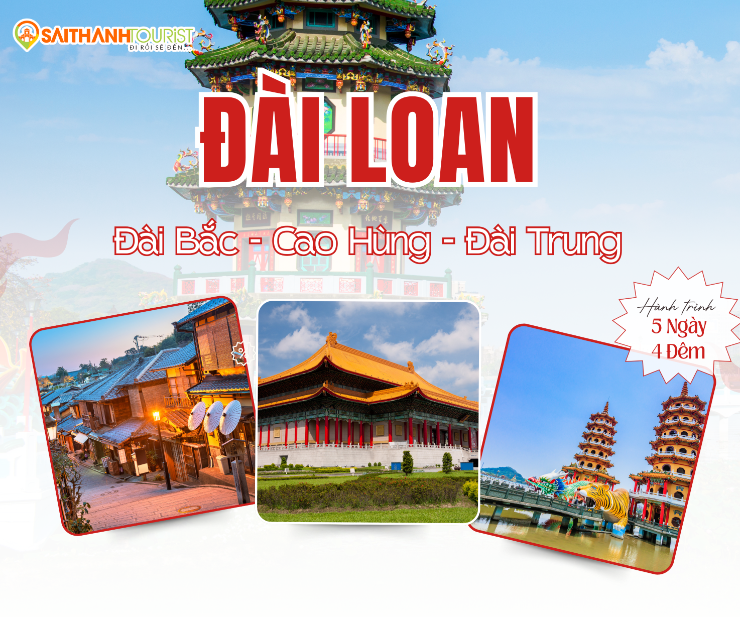 Hành trình: TP.HCM – Đài Bắc – Cao Hùng – Đài Trung – TP.HCM Thời gian: 4 Ngày 4 Đêm Hàng không: EVA AIR (Hãng hàng không 5 sao tốt nhất Đài Loan) Cam kết: HOÀN CỌC 100% NẾU KHÁCH RỚT VISA ĐOÀN