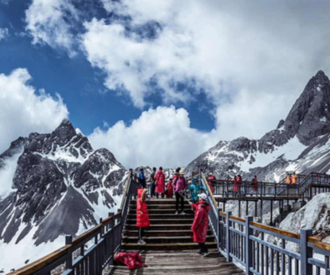 - Núi Tuyết Ngọc Long cách trung tâm phố cổ Lệ Giang về phía Bắc, quanh năm tuyết phủ trắng bao phủ một khu vực rộng lớn giống như con rồng lớn nên được gọi là “Ngọc Long”. Nơi đây còn được so sánh với “Thụy Sĩ Á Đông” như rặng Pyrenes (ngọn núi nổi tiếng tại biên giới Pháp và Thụy Sỹ). Đoàn đi cáp treo lớn lên núi với độ cao 4600m và chụp ảnh lưu niệm.